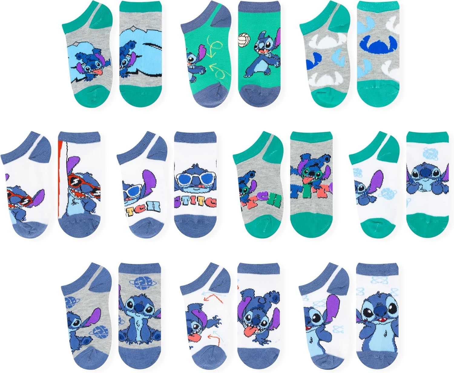 Disney Girls Socks - 10 Pack Crew Socks with Arch Support Featuring Princesses and Lilo & Stitch Designs for Ages 7-14