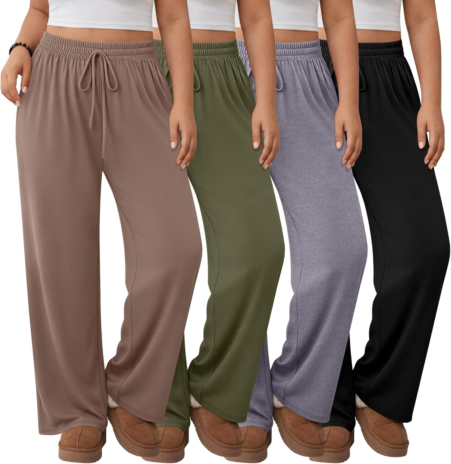 Neer 4 Pack Women's Plus Size Sweatpants Wide Leg Elastic Waist Lounge Yoga Pants Loose Fit Drawstring Jogger with Pockets