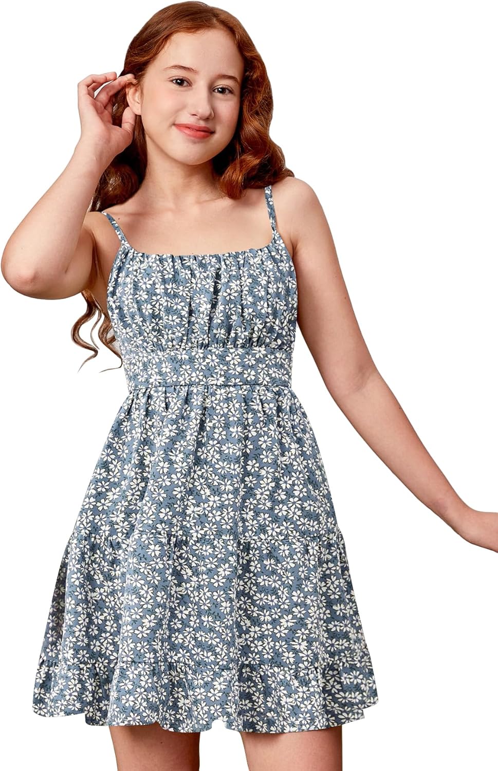 COZYEASE Girls' Floral Print Ruched Bust Ruffle Hem Sleeveless High Waist Cami Dress Boho Short Dresses