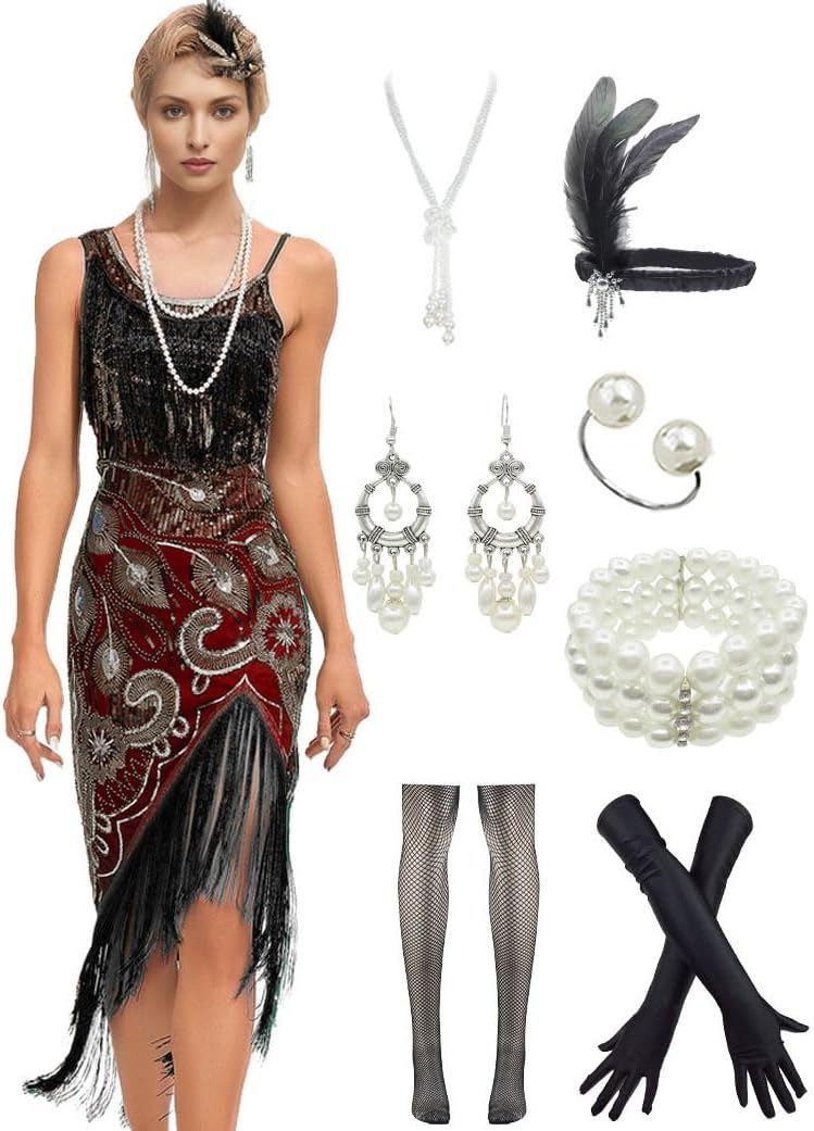 Peacock-inspired 1920s Gatsby Beaded Flapper Sling Dress Womens Vintage Cocktail Dress W/Complete Accessories Set
