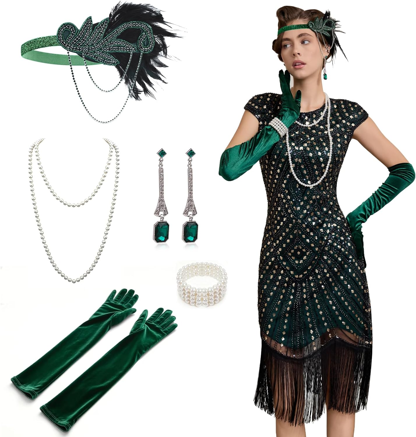 1920s Dresses for Women, Roaring 20s Great Gatsby Flapper Dresses Fringed Sequin Vintage Dress with Accessories Set