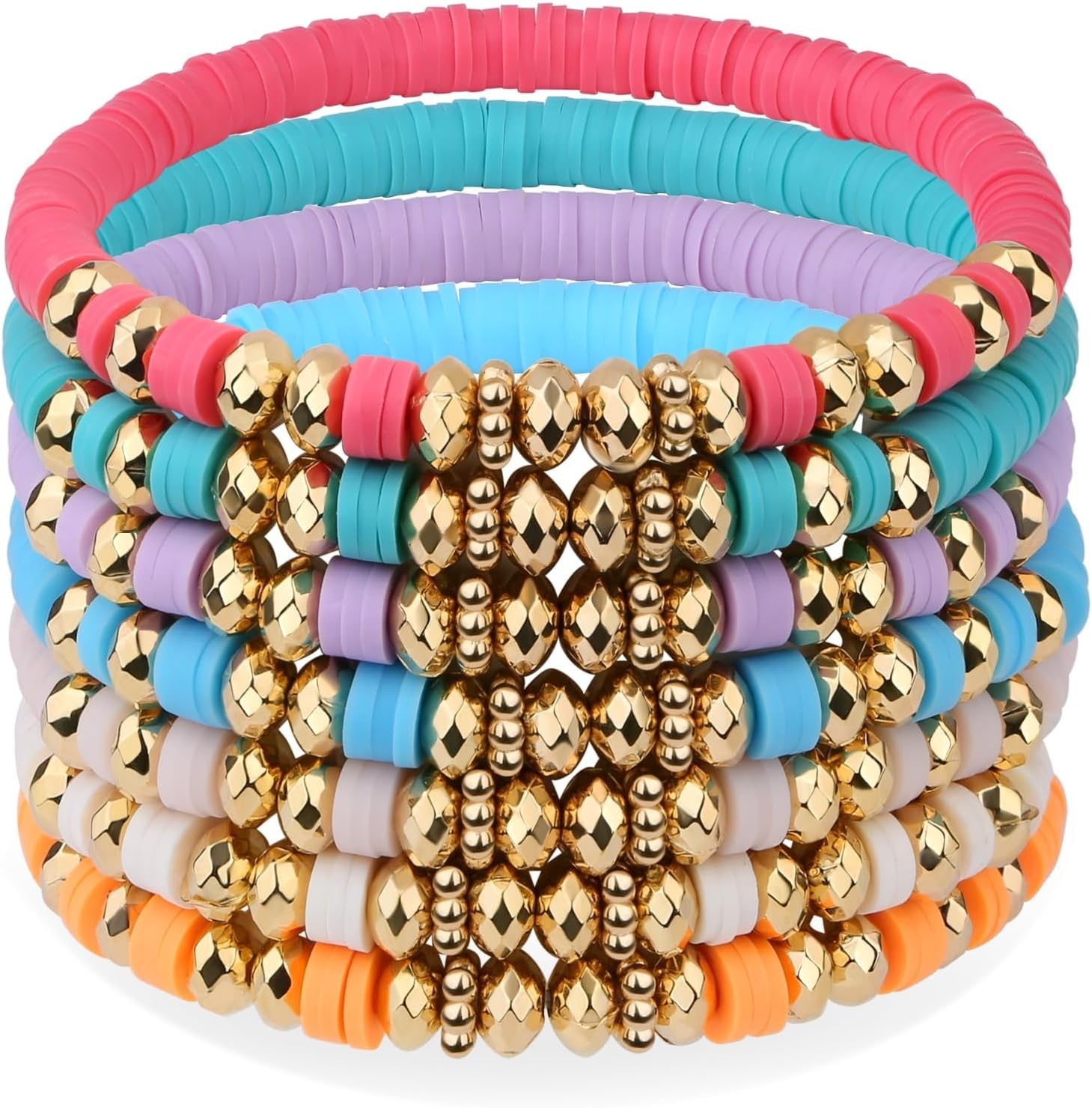 XIANNVXI 7pc Heishi Clay Bead Bracelets for Women Gold Plated Beaded Bohemian Stackable 6.8In Stretch Bracelets Elastic Layering Friendship Jewelry Boho Gift Set