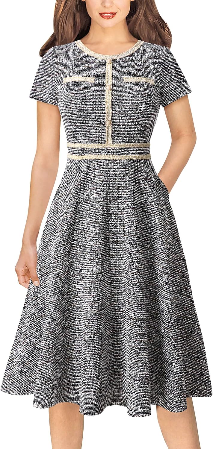 VFSHOW Womens Buttons Pockets Office Business A-Line Dresses Short Sleeve Work Crew Neck Tweed Trim Fit and Flare Swing Dress