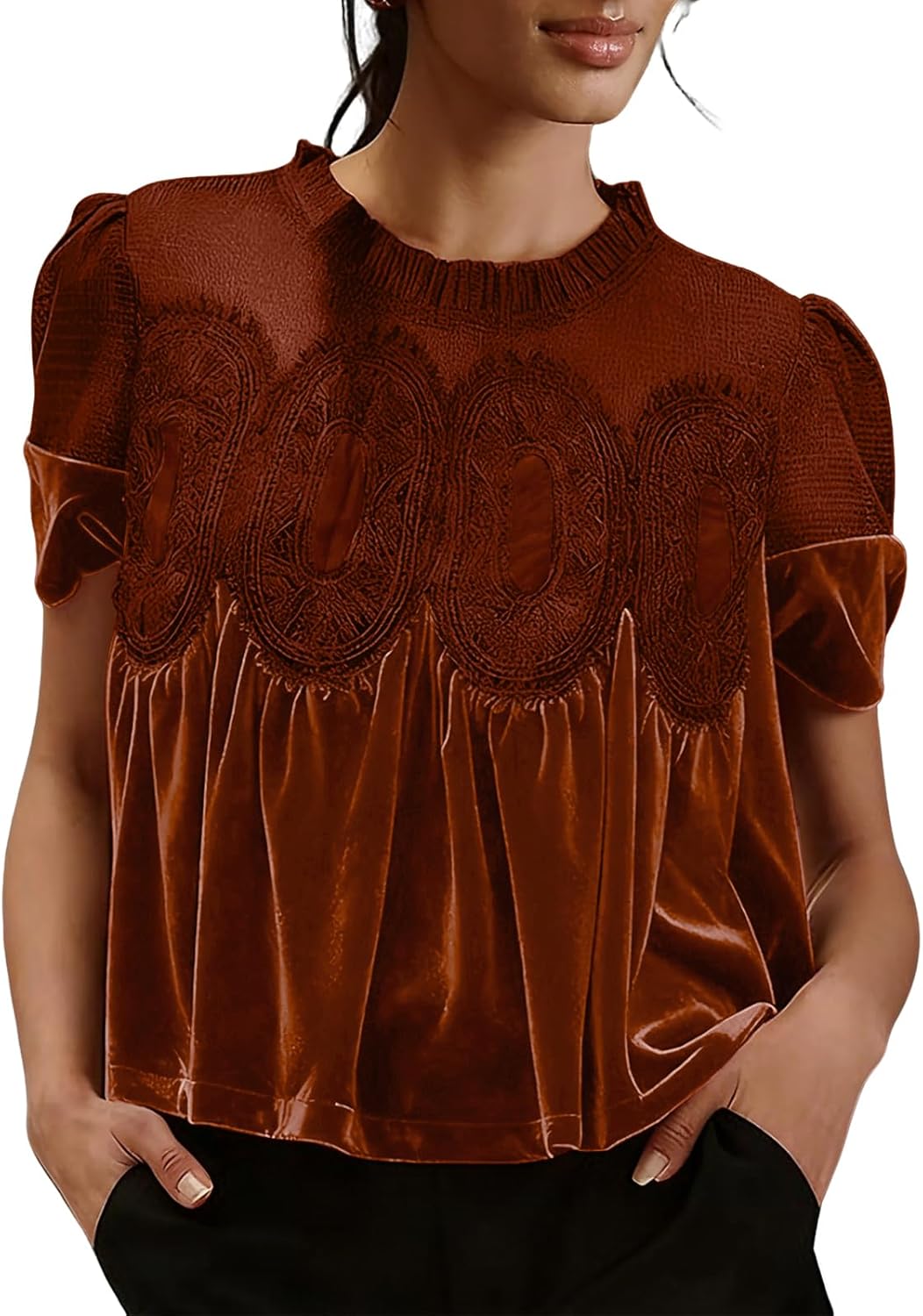 Women's Velvet Lace Babydoll Tops Casual Round Neck Short Sleeve Flared Swing Blouse Elegant Pleated Loose Fit Shirts