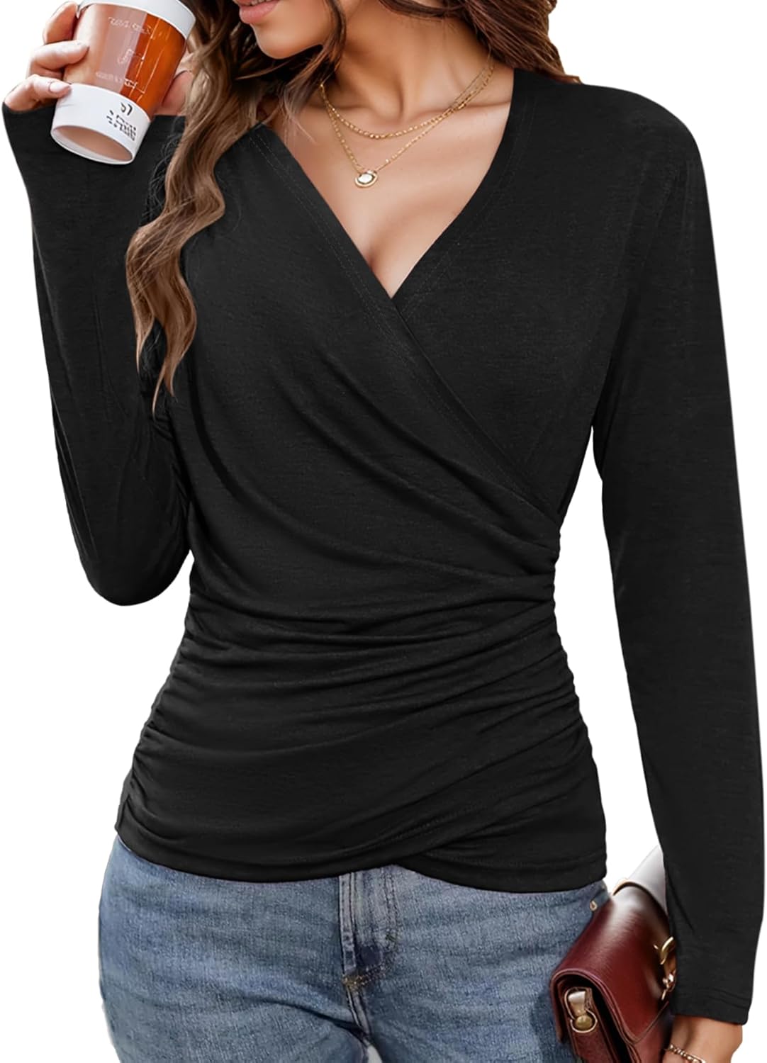 Women's Deep V Neck Cross Wrap Top, Long Sleeve Trendy Fall Ruched Asymmetricl Slim Fit Dressy Blouse