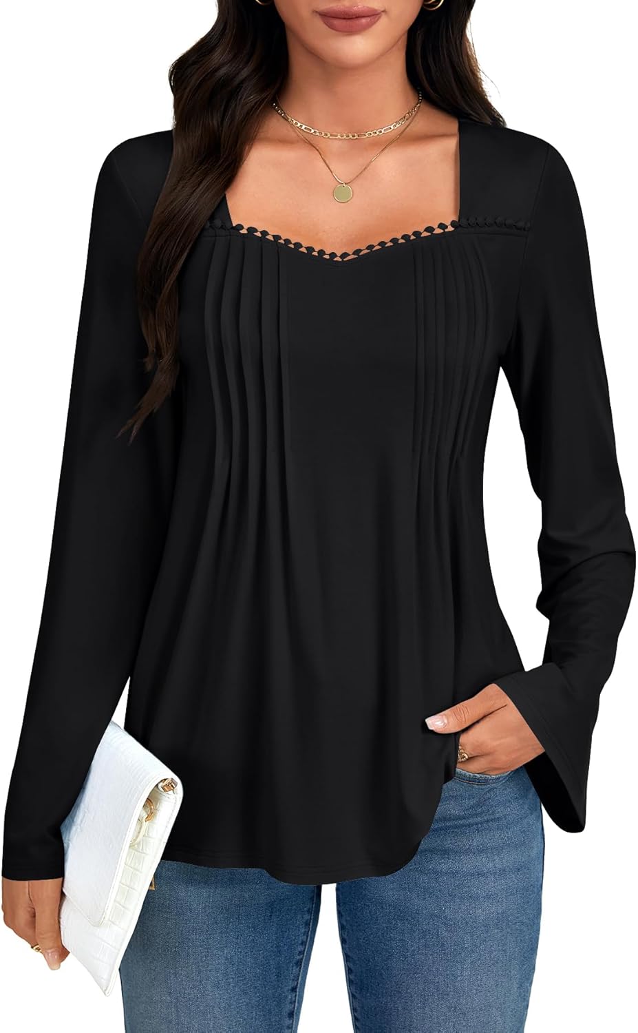 Umenlele Women's Sweetheart Neck Pleated Front Long Sleeve Casual Loose Tunic Tops Blouse