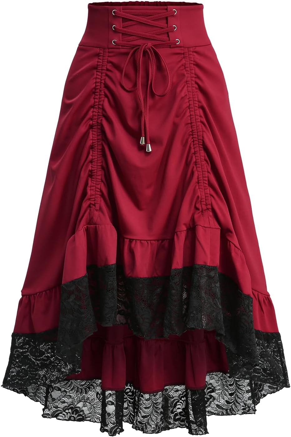 Womens Goth Steampunk Black Floral Lace A Line Midi Red Skirt Lace up Ruched High Low Asymmetrical Pirate Skirts