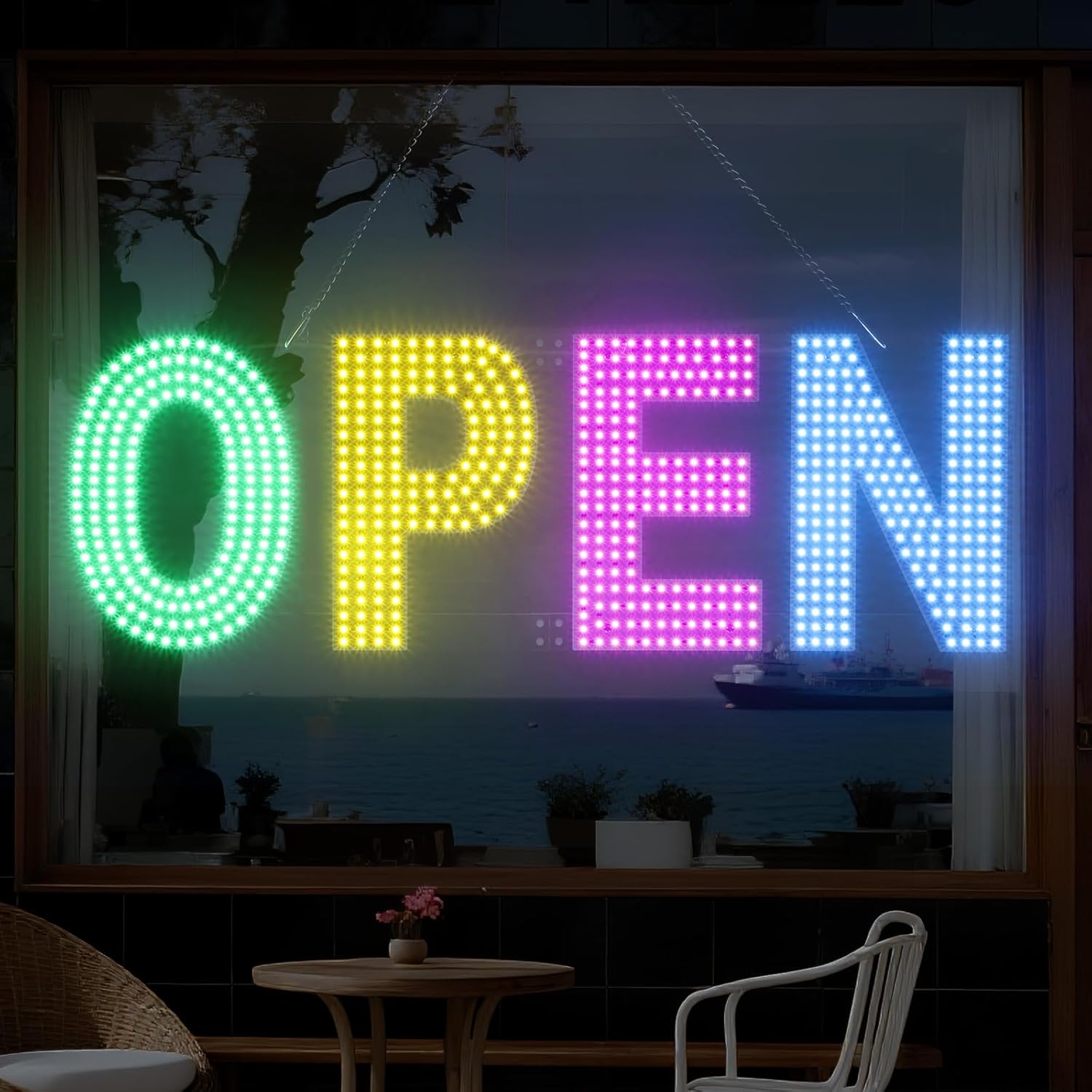 - Extra Large LED Open Sign:30'' X 10''.It's made of 550 super bright LED beads,ultra-bright, striking green yellow pink blue.It is much brighter and most cost effective than regular LED,which offer a great visibility even in daylight.