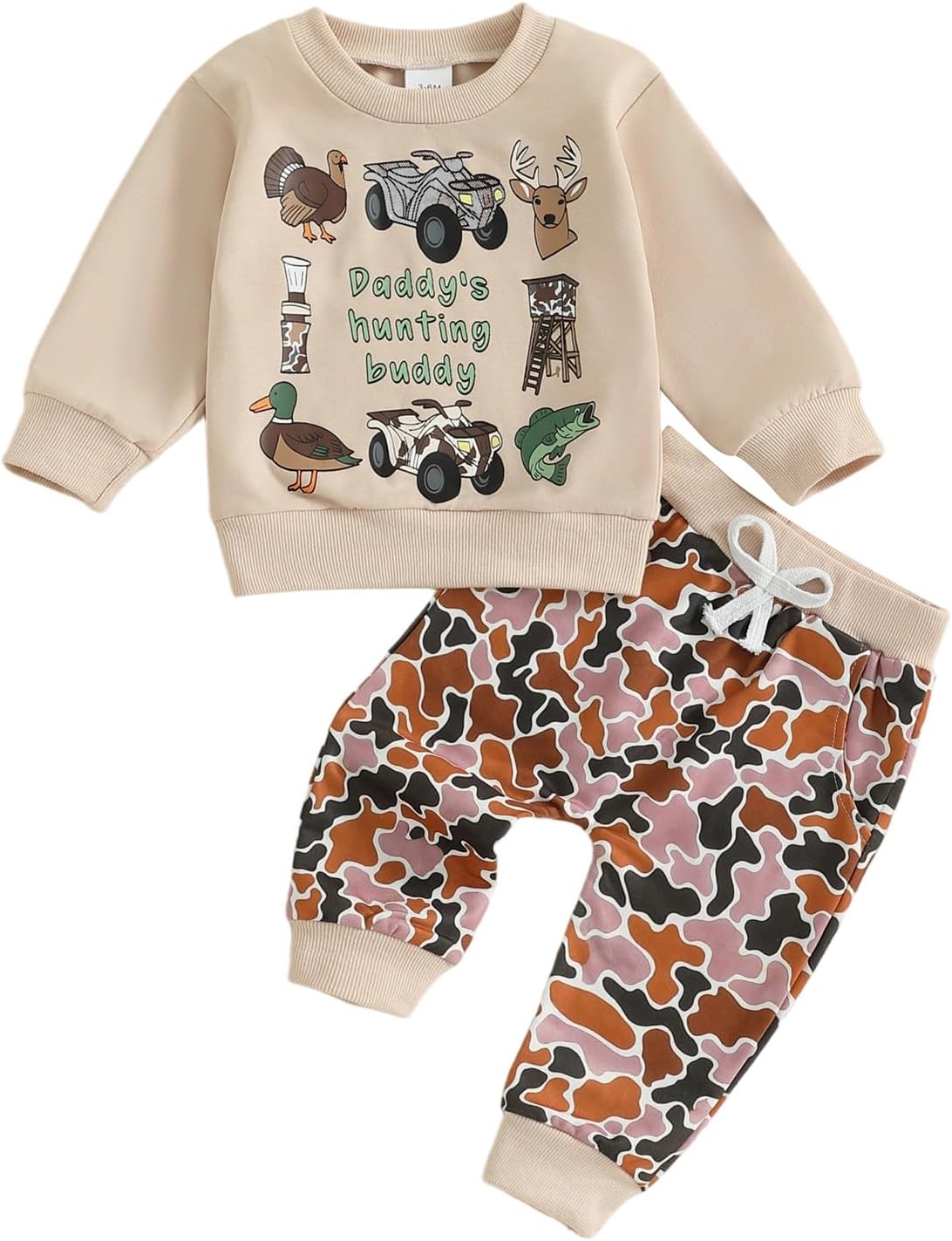 Toddler Baby Boy Hunting Clothes Retro Embroidery Duck Long Sleeve Sweatshirt Camo Pants Fall Winter Outfits