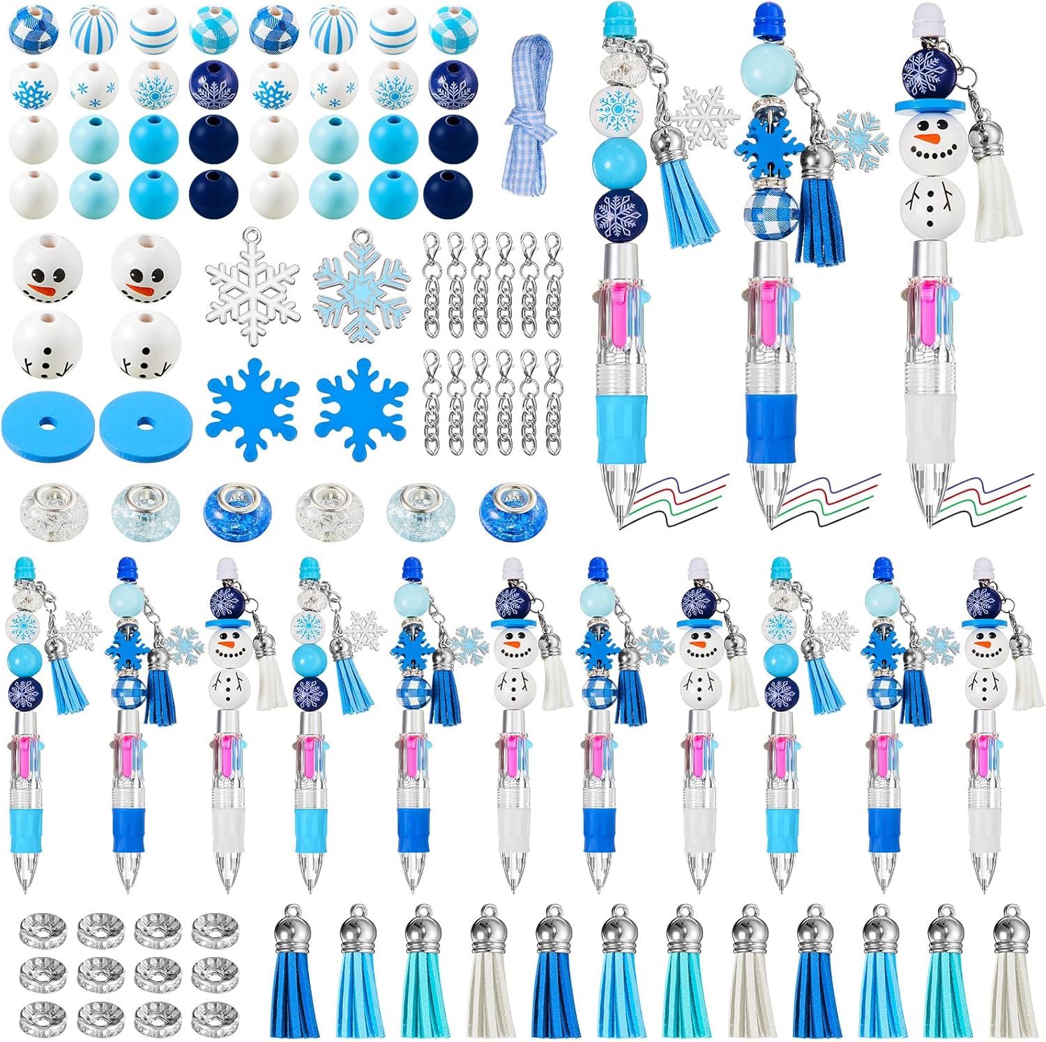 - Winter DIY Pens Bulk: you will receive 12 pcs 4 in 1 beadable pens, 16 wooden beads, 6 dazzling crystal spacer beads, 12 small spacer beads, 12 tassels, 12 lobster clasp, snowflakes and snowman decorations, as well as special hat; With plenty of supplies to fulfill your daily needs and replacements, this kit allows you to unleash your creativity with friends, effortlessly creating a charming winter Christmas party atmosphere