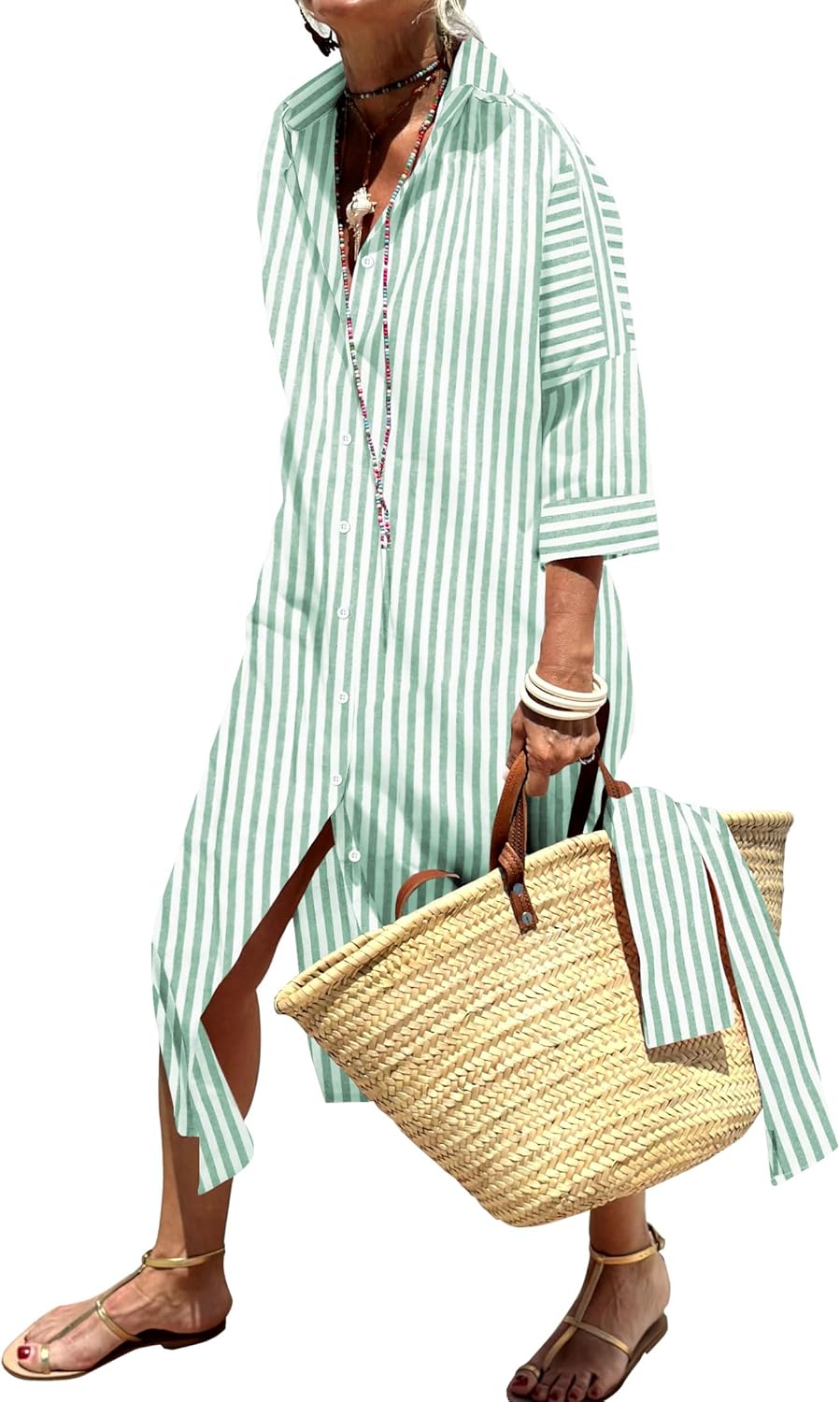 Womens Shirt Dresses Striped Lapel 3/4 Sleeve Maxi Dress Button Down Split Belted