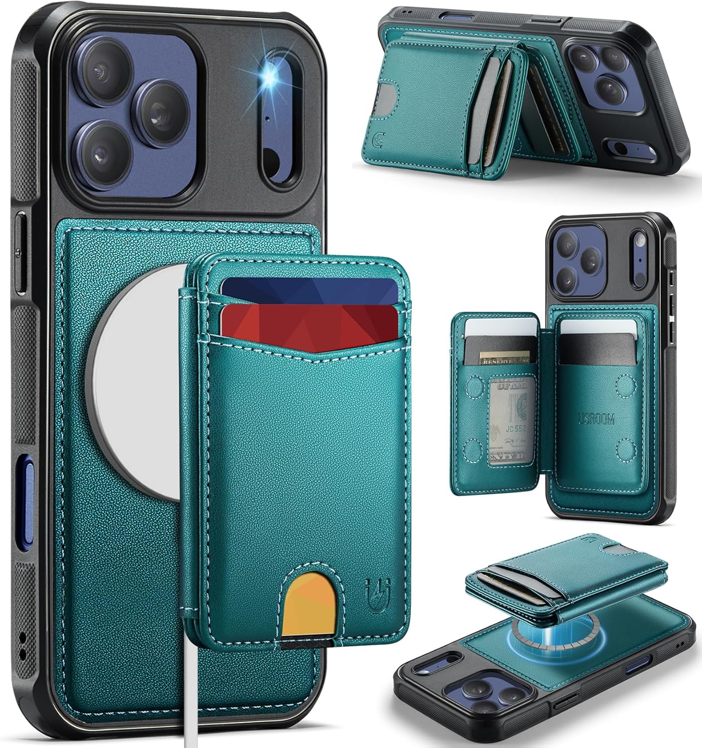 for iPhone 17 Pro Wallet Case Compatible with Magsafe, Magnetic RFID Blocking Card Holder Kickstand 2 in 1 Detachable Case for iPhone 17 Pro 6.3", Bluish Green