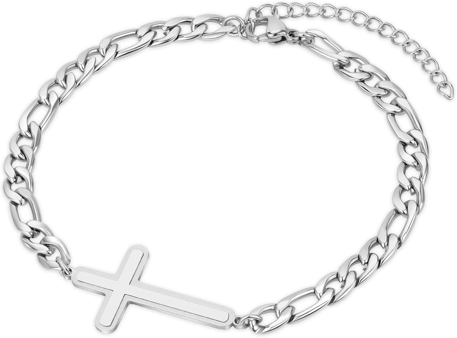 Silver Cross Bracelet for Men Teens, Stainless Steel Cuban/Figaro Cross Chain Link Bracelet 5mm 7+2 Inches, Christian Religious Jesus Confirmation Jewelry Gifts for Him