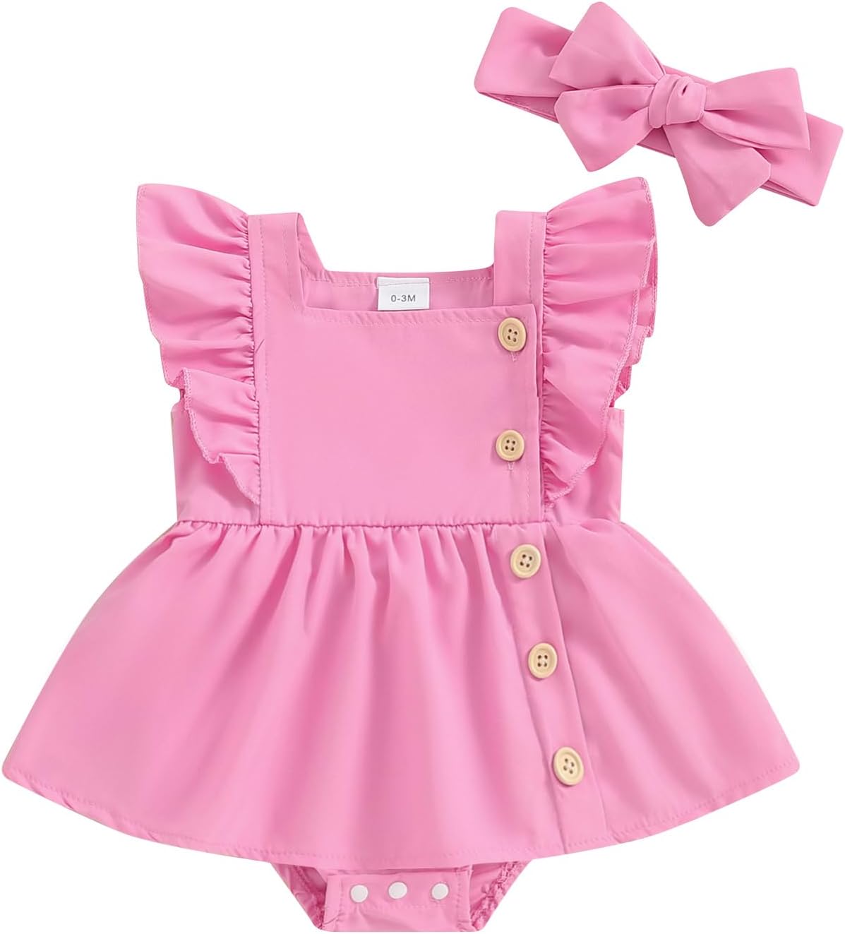 Madjtlqy Newborn Baby Girl Summer Clothes Romper Dress Ruffle Sleeve Solid Color Outfits with Headband