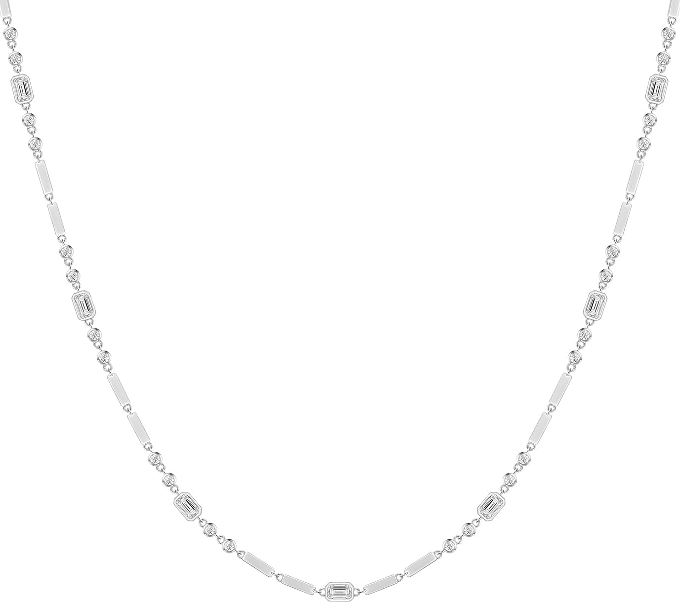 TIGRADE Silver Chain Necklace for Women Dainty Rectangular Round Emerald Bezel CZ Anniversary Wedding Necklace Extenders Link with Lobster Clasp 16 Inch