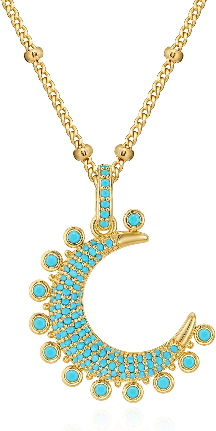 Fettero Gold Necklace for Women, Dainty 14K Gold Plated Turquoise Necklace Jewelry Charm Moon Circle Heart Beadeds Pendant Necklaces for Women Gift