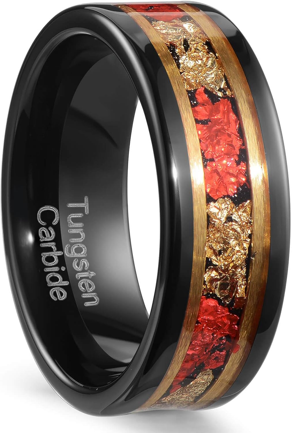 8mm Men's Tungsten Ring Engagement Wedding Ring, Red and Gold Inlay, Black Shiny, Size 7-14, Comes with Gift Box