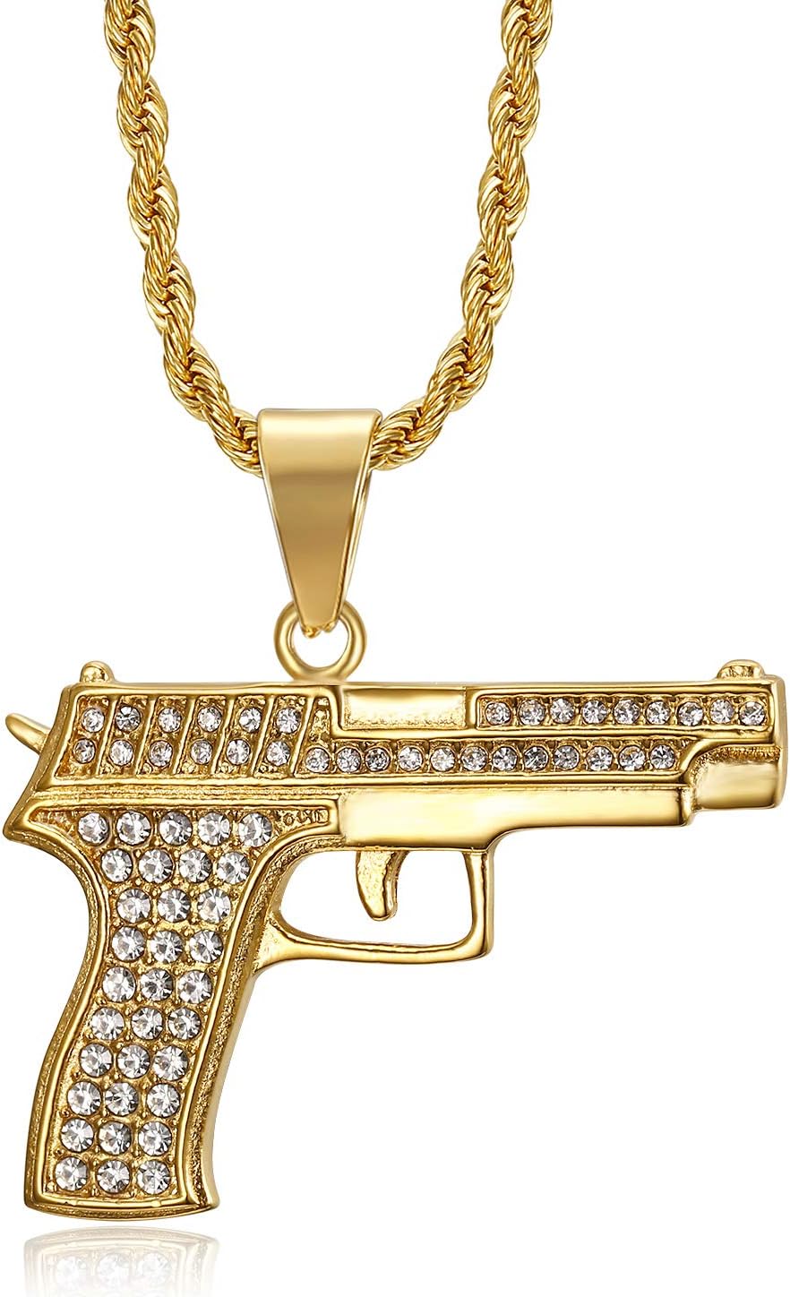 NEGS 18K Gold Plated Prayer Hand with Gun Pendant Stainless Steel Rock Necklace for Men Women, 24 Inch Chain Hip Hop Rock Amulet Jewelry Gift