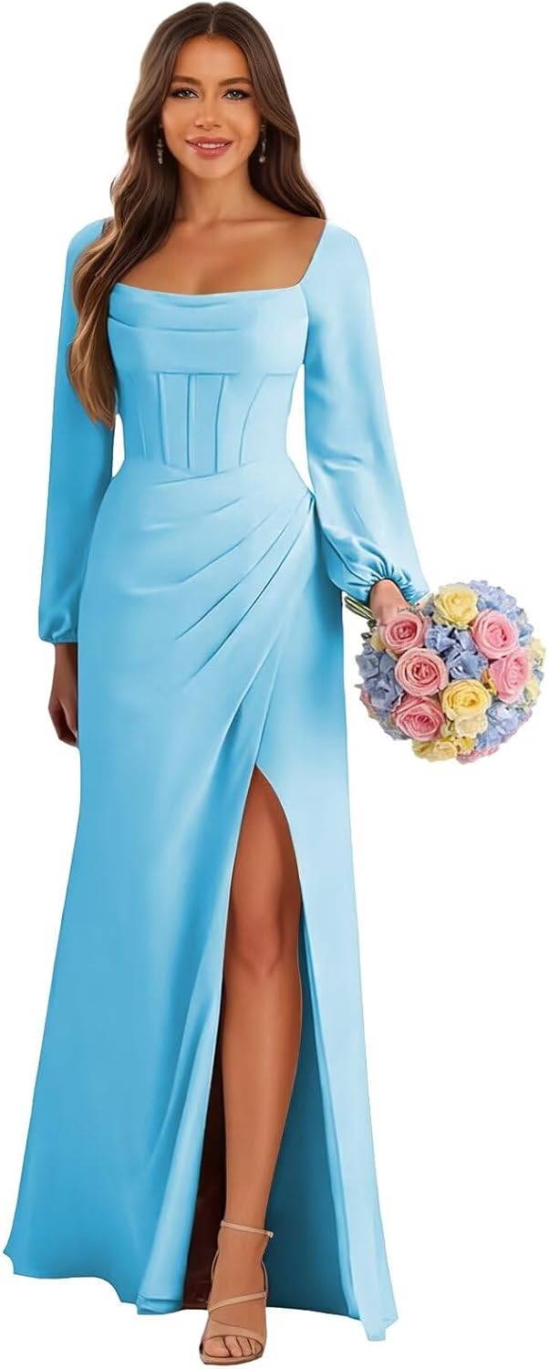 Long Sleeve Bridesmaid Dresses for Women Chiffon Square Neck A-line Pleated Wedding Guest Dress with Slit