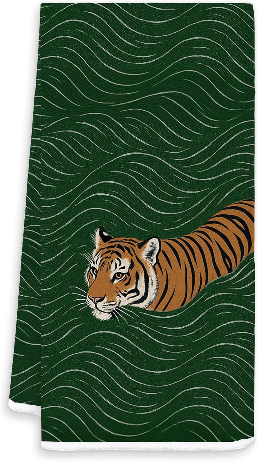 Dark Green Japanese Tiger Kitchen Towels, Vintage Ukiyo-e Japan Swimming Tiger Decorative Hand Tea Towels for Bathroom, Minimalist Asian Animal Dish Tea Towel for Kitchen, 16x24 Inches