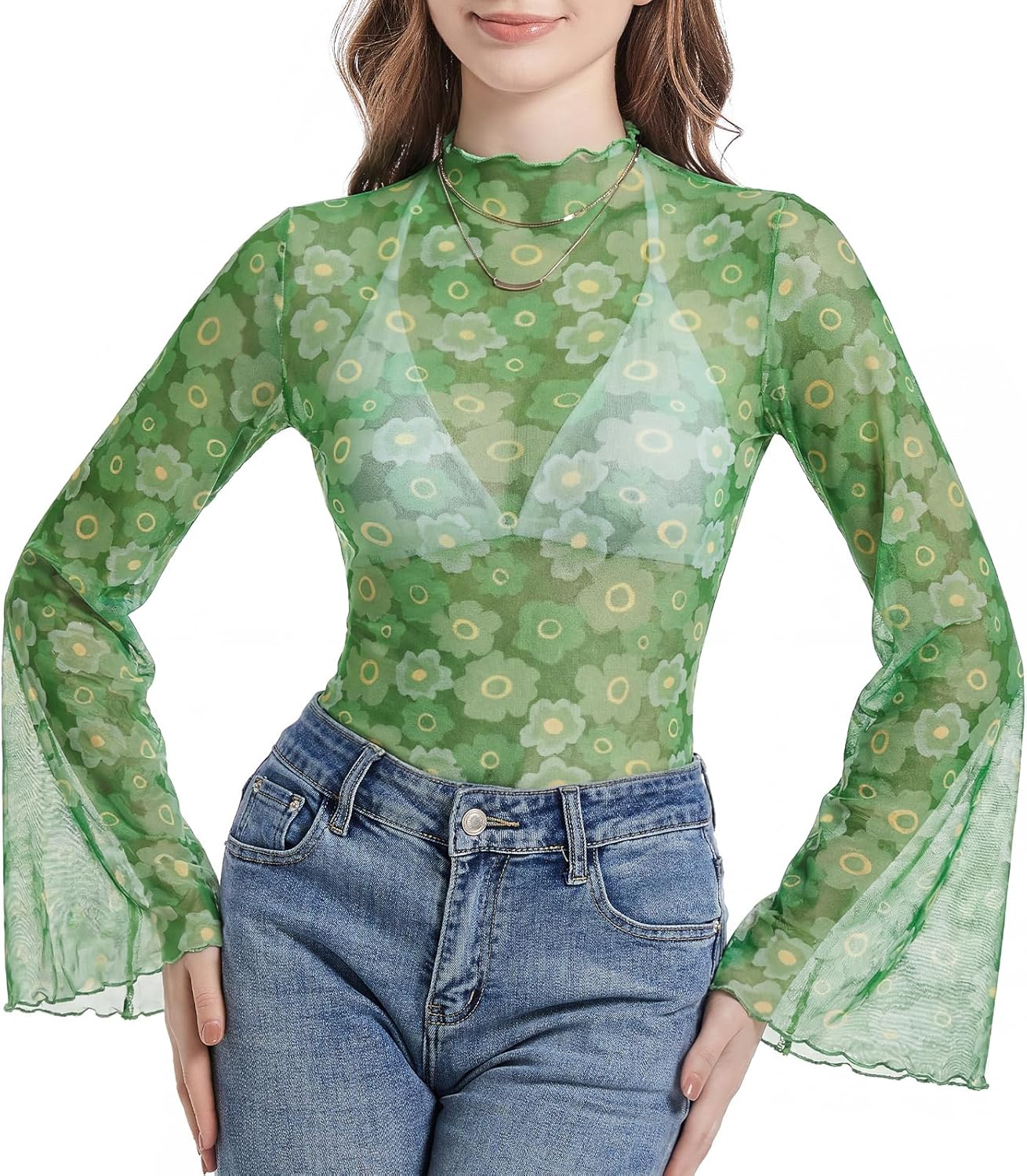 Durio 70s Womens Bell Sleeve Top Floral Tops for Women Disco Outfit Mock Neck Tops Semi Sheer Mesh Long Sleeve Top