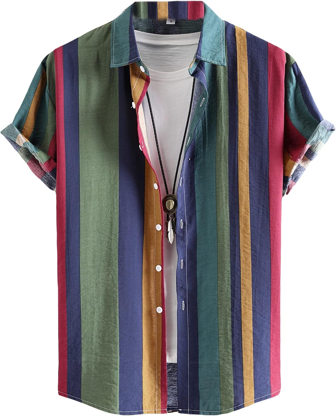 OYOANGLE Men's Color Block Striped Print Short Sleeve Button Up Casual Shirt