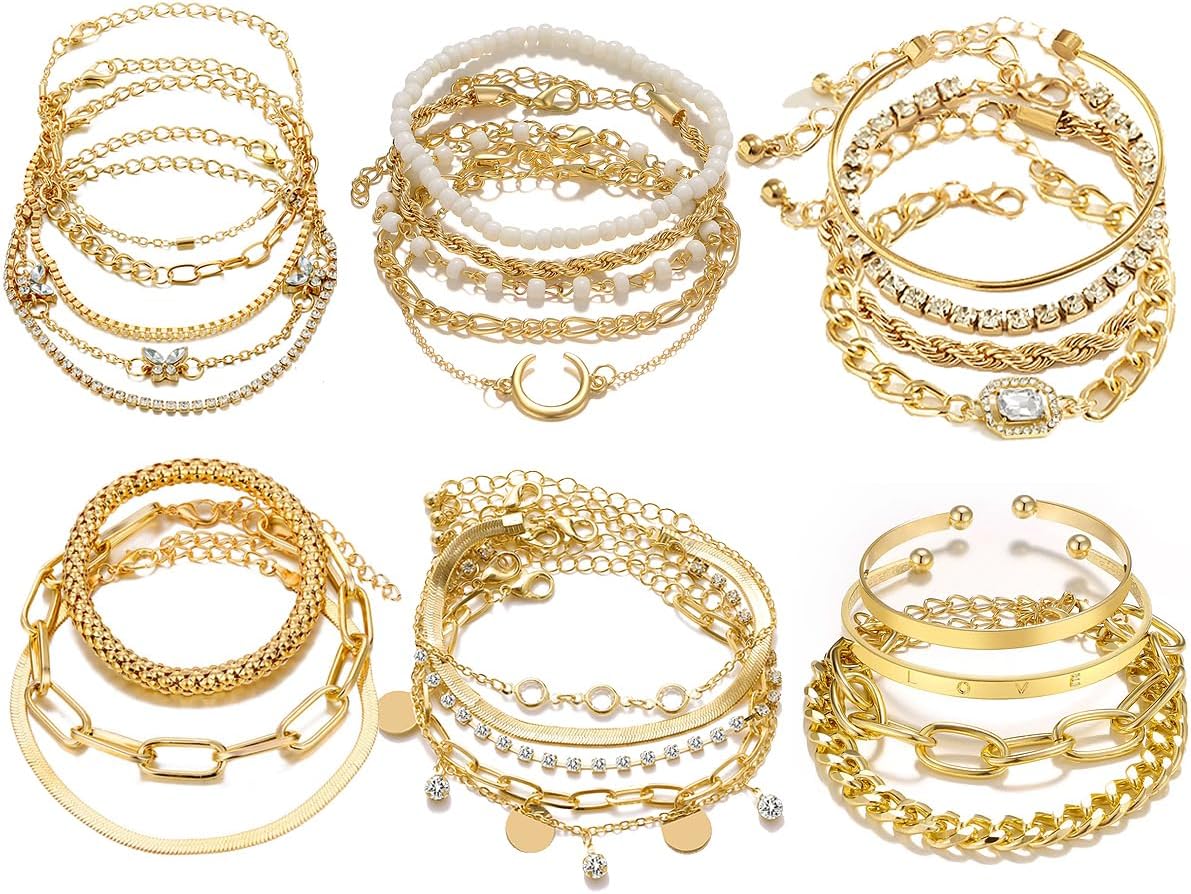 28pcs Gold Chain Bracelets Set for Women 14K Gold Plated Multiple Layered Bangle Adjustable Link Bracelet Anklet Fashion Accessories Jewelry Gift