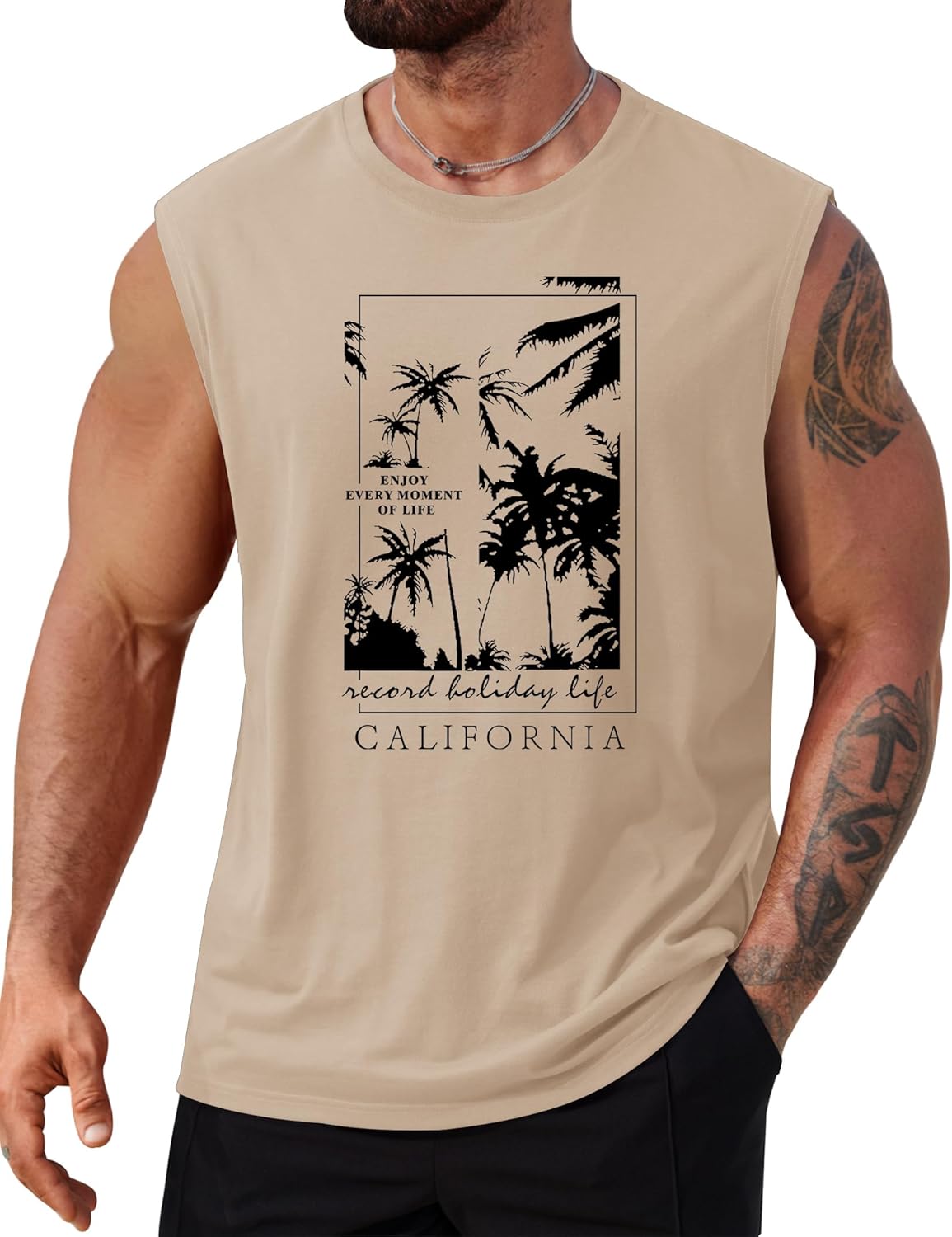 Mens Beach Summer Tank Tops Palm Tree Graphic Vacation Muscle Sleeveless Shirts (S-3XL)