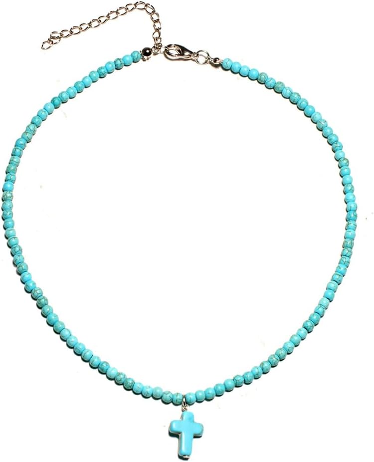 Green Turquoise Necklace Natural for Women Boho Turquoise Beaded Chain Necklace Dainty Small Cross Pendant Summer Beach Jewelry Gift
