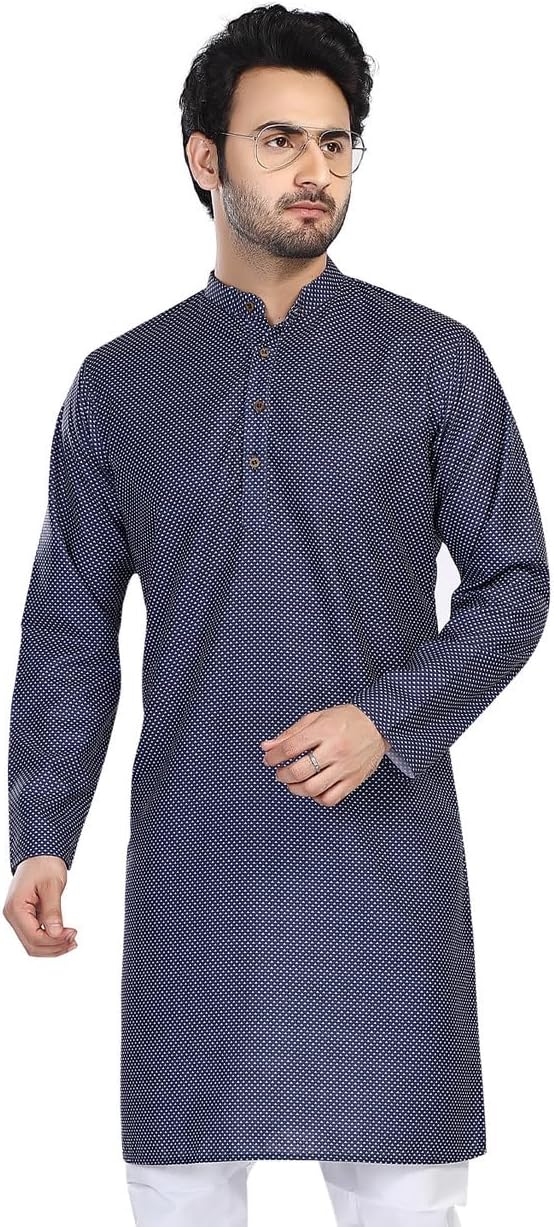 In-Sattva Men's Indian Folk Print Banded Collar Knee-Length Kurta Tunic