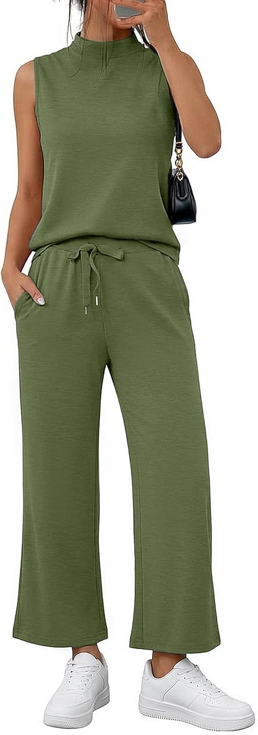 Casly Lamiit Womens 2 Piece Sets Sleeveless Mock Neck Summer Lounge Sets Wide Leg Crop Pants 2026 Vacation Travel Outfits
