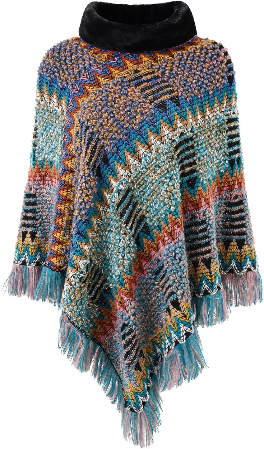 Ferand Women's Cozy Boho Turtleneck Poncho Sweater with Fringe Stylish Chevron Design for Winter