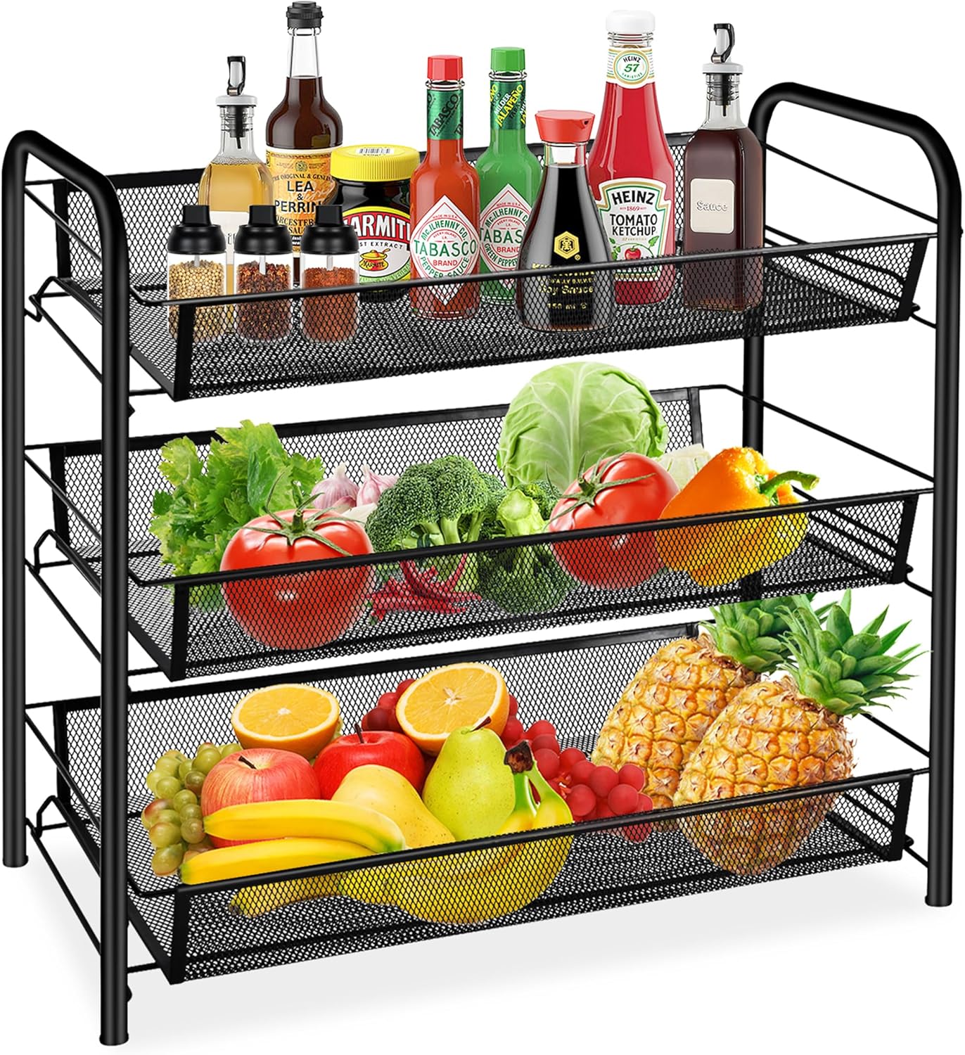 CVHOMEDECO. 3 Tier Fruit Basket Large Capacity Rectangular Metal Fruit Bowl Detachable Metal Fruit Stands Organizer for Kitchen Counter, Bread, Vegetable, Snack and Fruits. Black