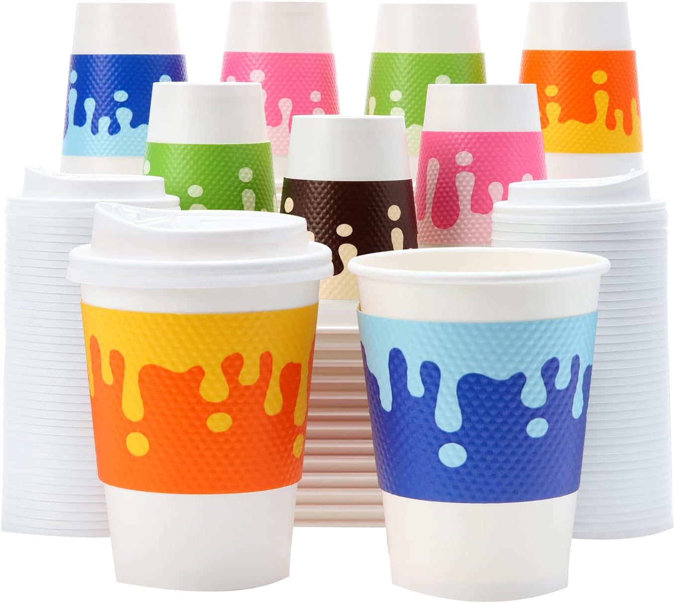 - Disposable Coffee Cups: Our 12oz white coffee cups come with orange, green, pink, blue and brown sleeves. The colorful sleeves make these paper cups perfect for spring festivals and parties such as Easter parties