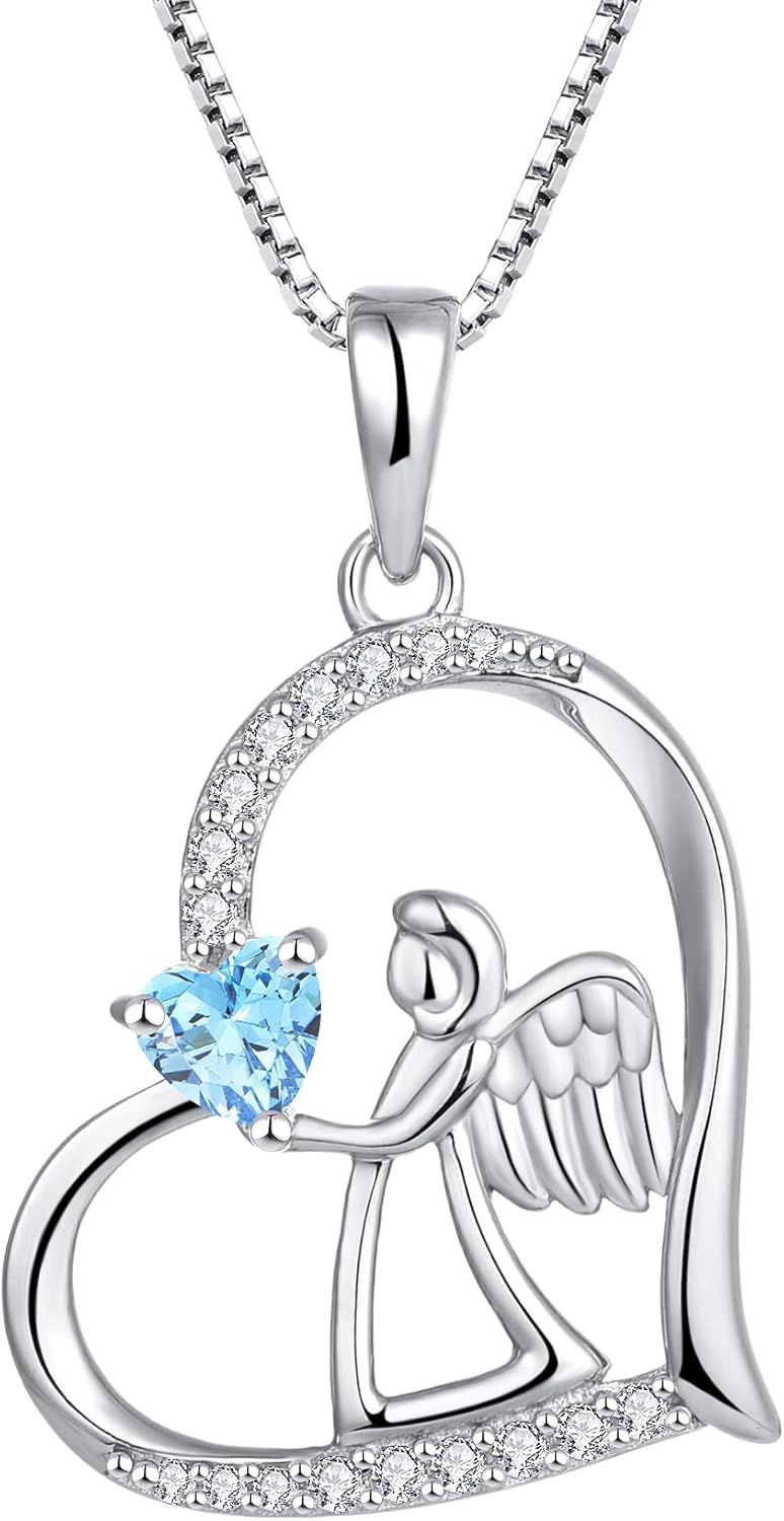 FJ Heart Guardian Angel Necklace 925 Sterling Silver Angel Wing Pendant Birthstone Jewelry for Women
