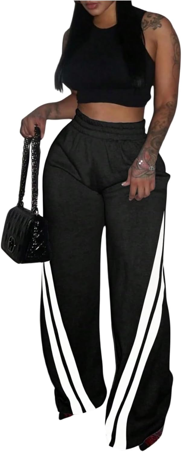 WDIRARA Women's Striped Elastic Waist Wide Leg Sweatpants Athletic Workout Baggy Pants