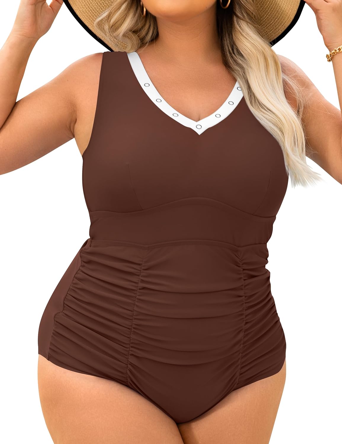 Womens Plus Size One Piece Swimsuits Retro Tummy Control Bathing Suit V Neck Color Block Full Coverage Swimwear