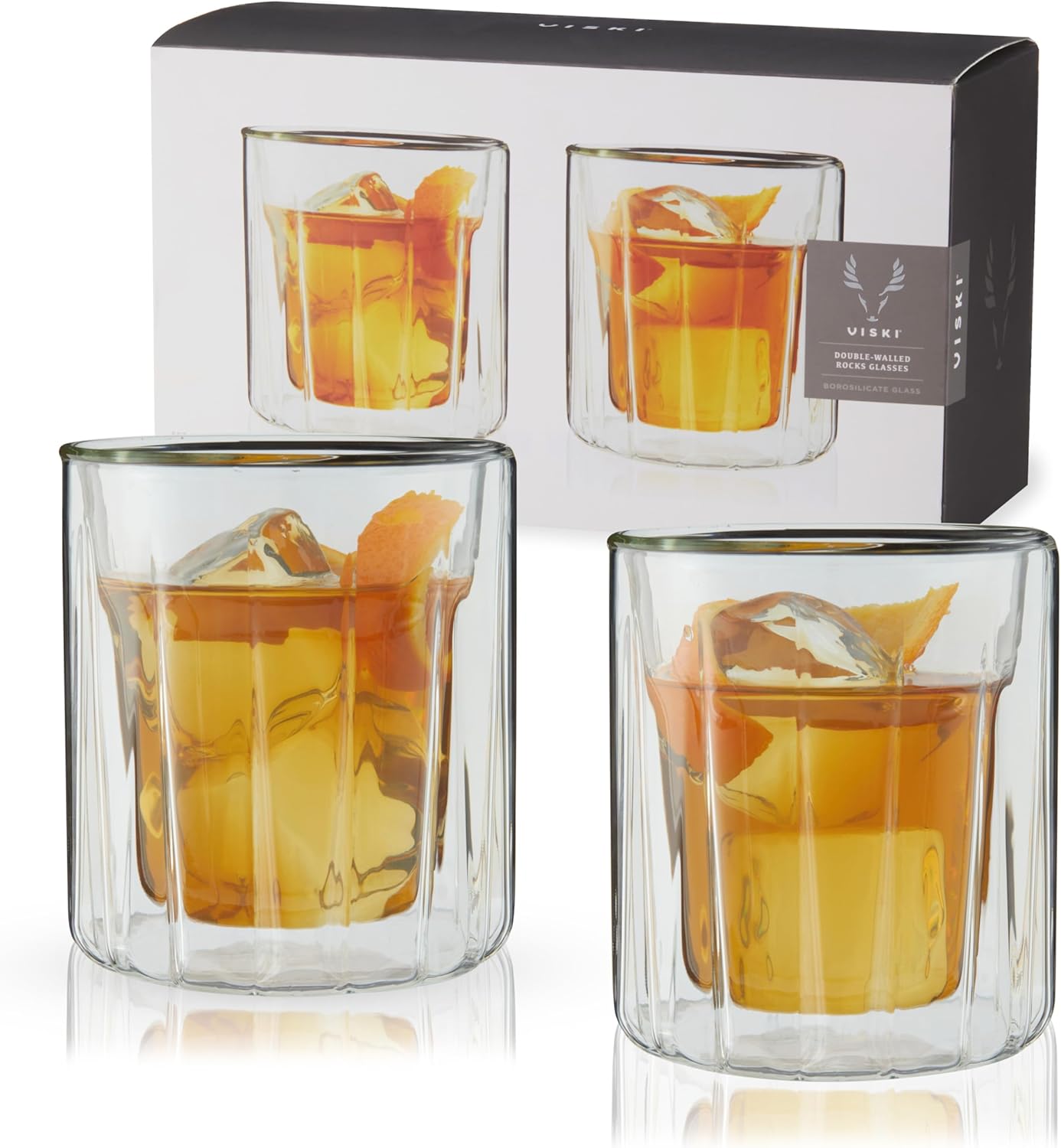 Viski Double Walled Rocks Glasses - Insulated Whiskey Tumblers with Cut Crystal Design - Dishwasher Safe 10.5oz Set of 2