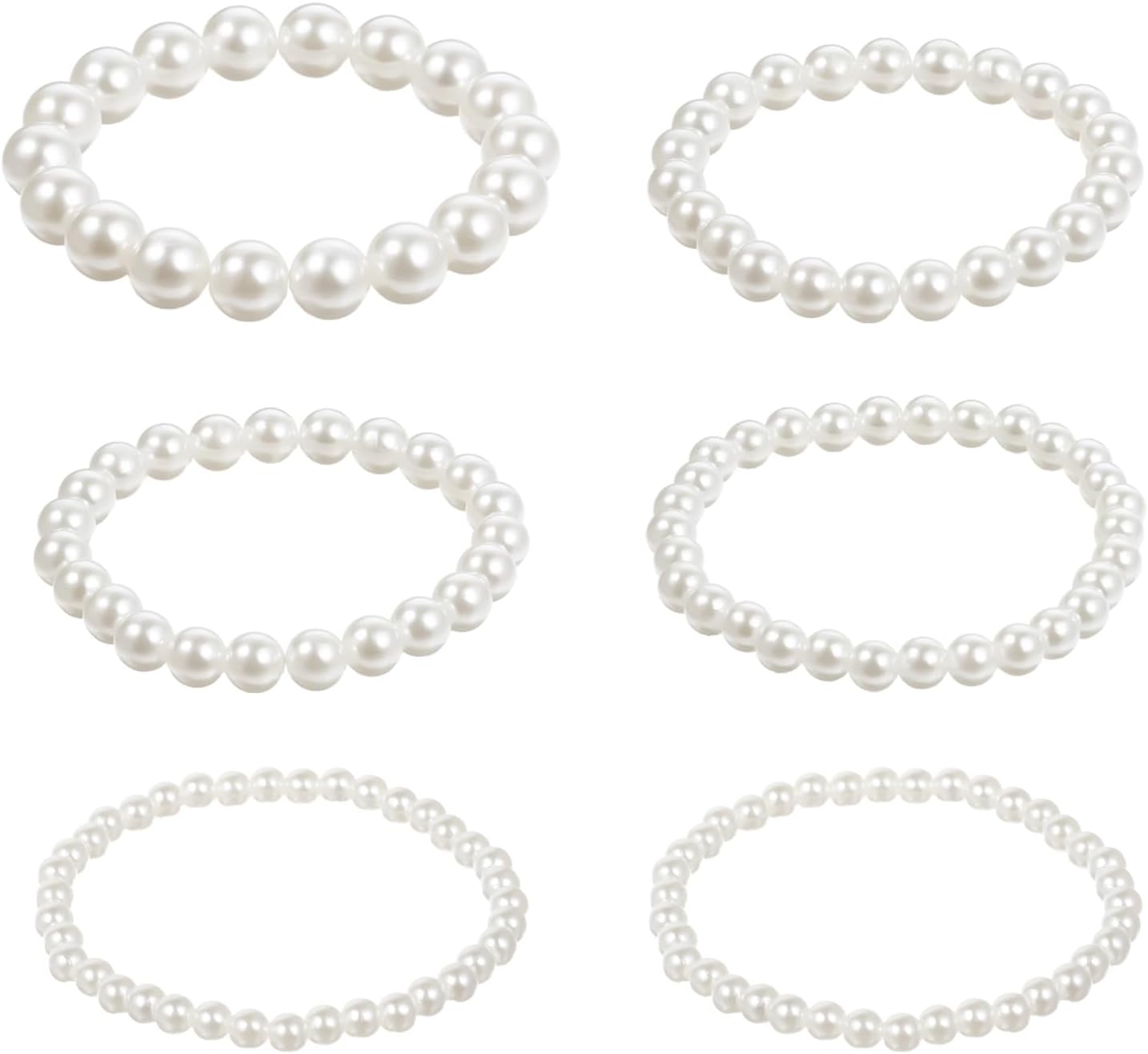 6 PCS White Pearl Bracelets, Elastic Faux Pearl Bracelet Stretch, Stackable Fake Pearls Bead Bracelets Bridesmaid for Women Daily Wear Bridal Wedding Party Gift (10/8/6/5 mm Pearl)