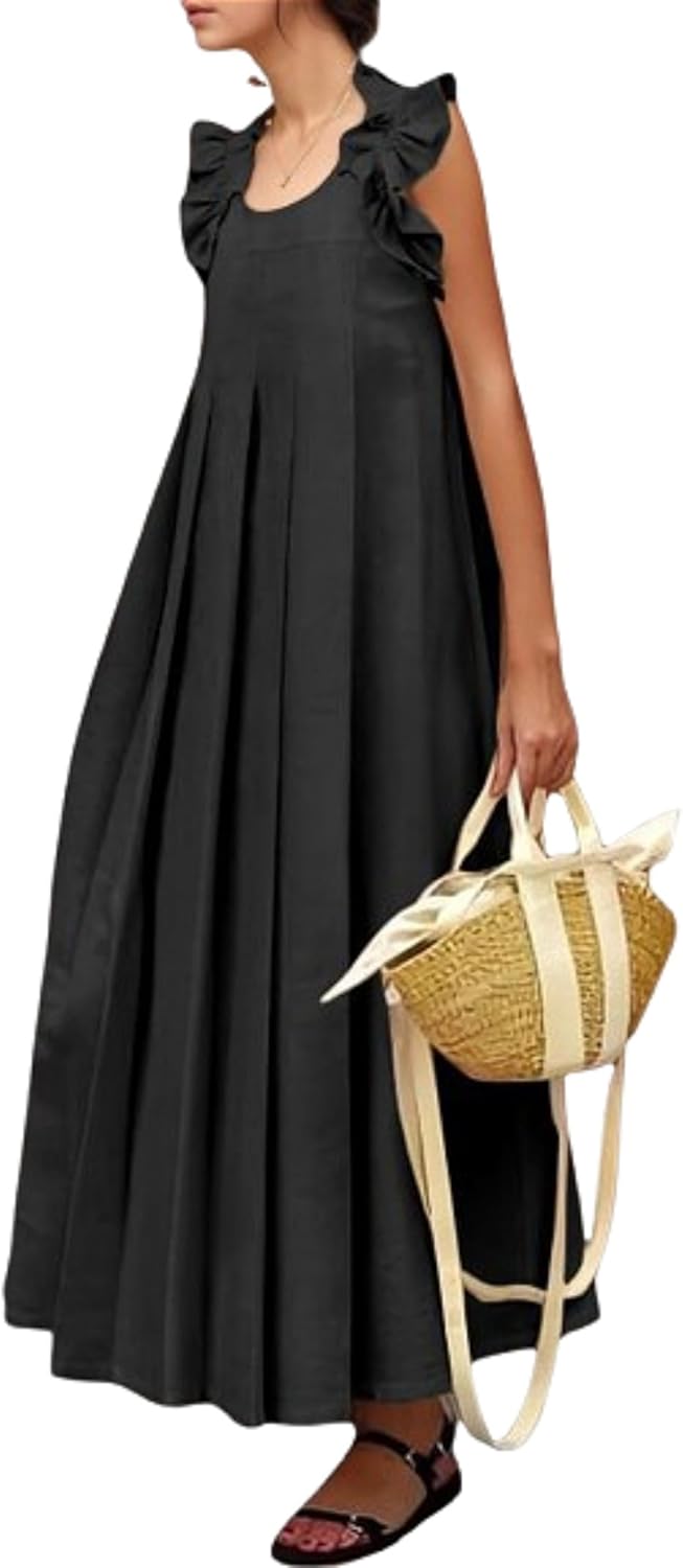 Boho Ruffle Maxi Dress Women Sleeveless Pleated Skirt Casual Sundress Summer Vacation Outfits Loose Fit Beach