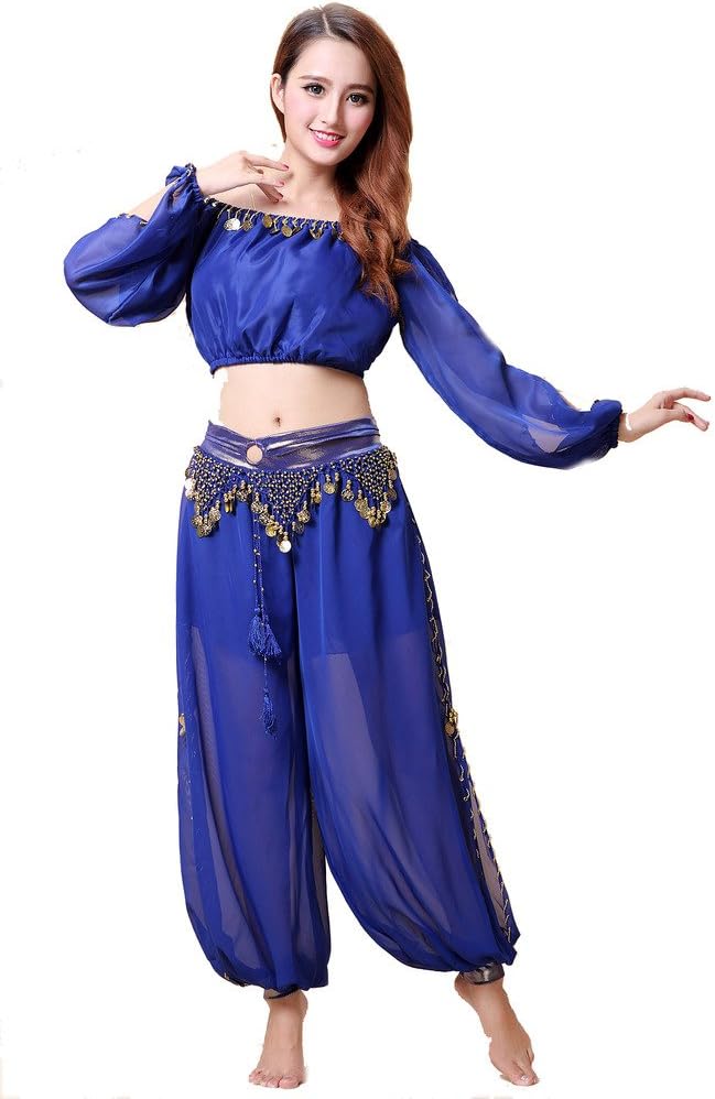 Belly Dance Chiffon Long Sleeves Top and Lantern Coins Pants Black, One Size