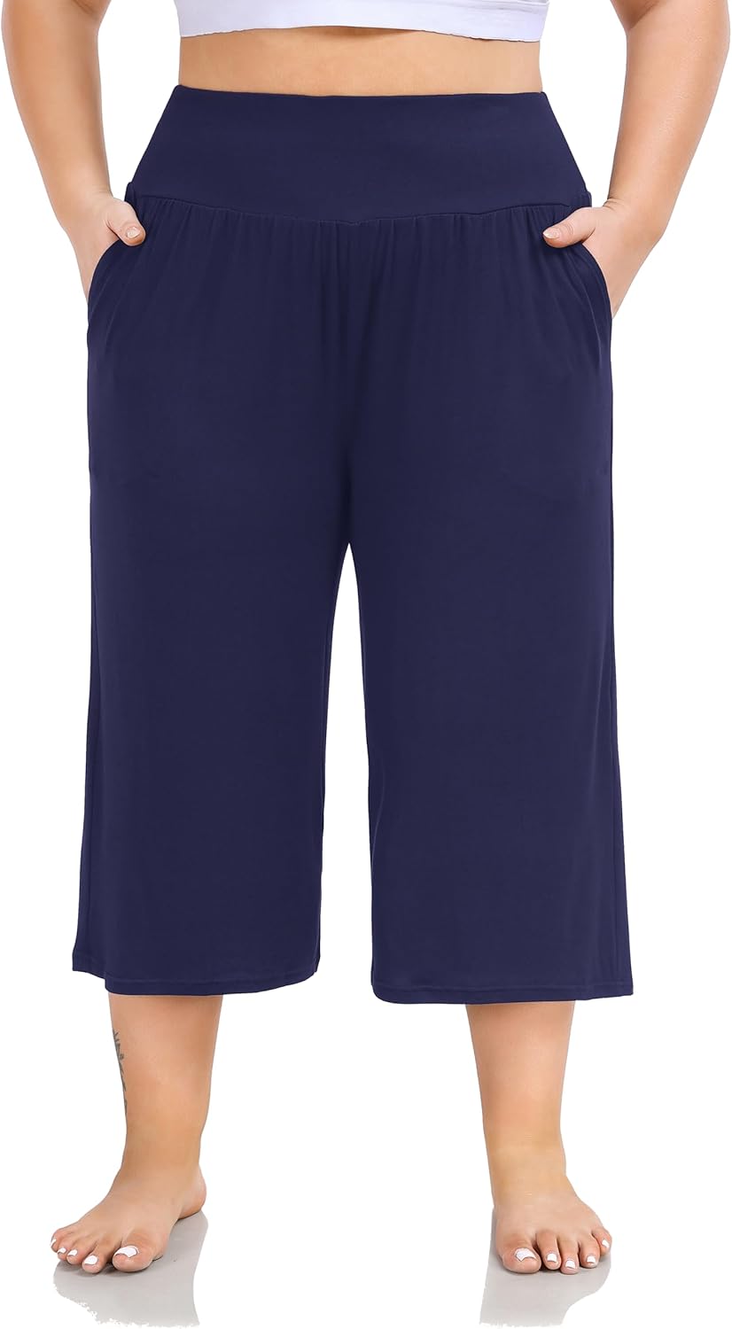 ZERDOCEAN Women's Plus Size Wide Leg Capris High Waist Yoga Pants Casual Loose Lounge Pants with Pockets