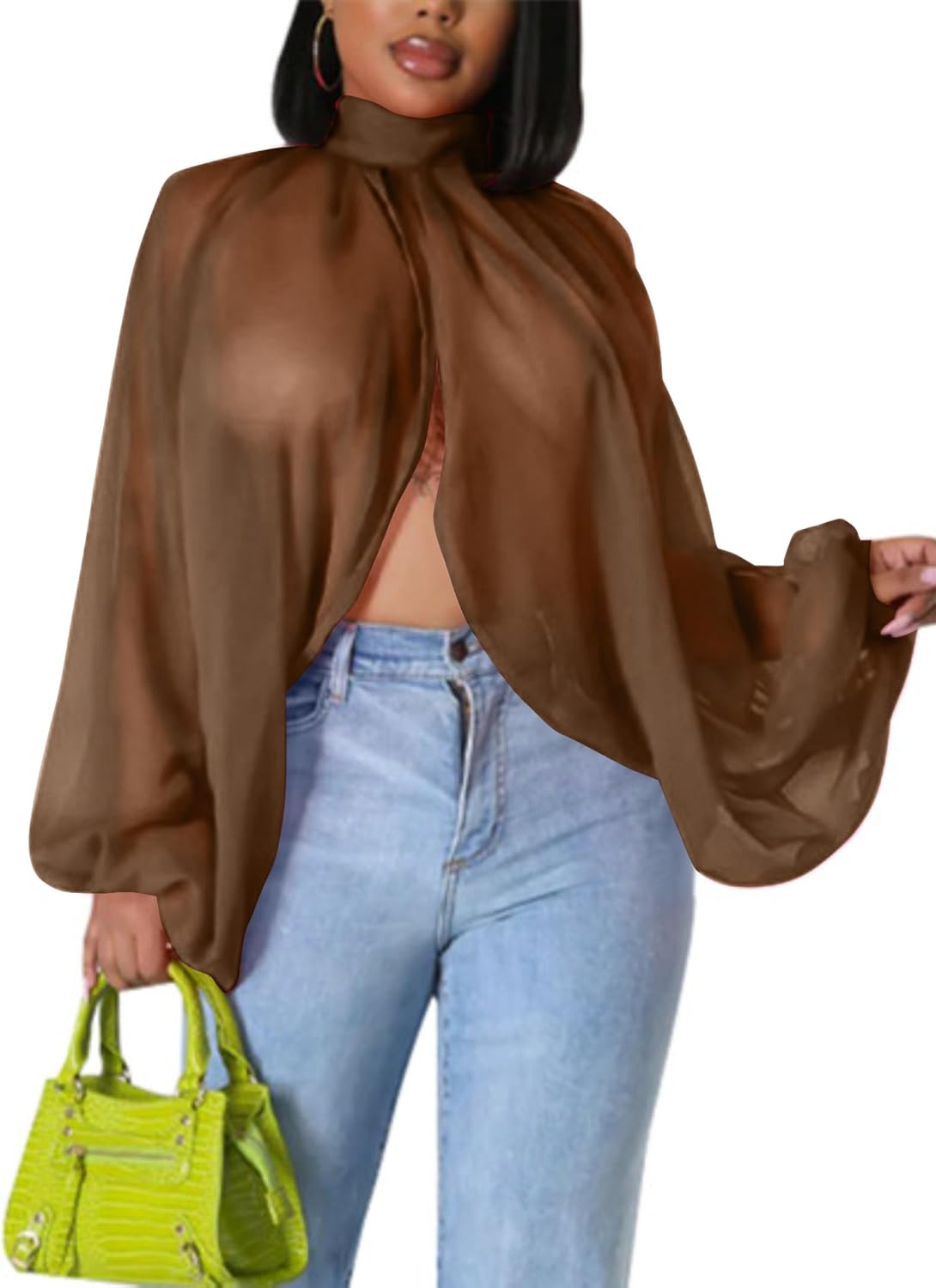 Sexy Tops for Women Party Club Night Batwing Sleeve Chiffon Sheer Self Tie Back Front Open Women Shirts Casual Summer