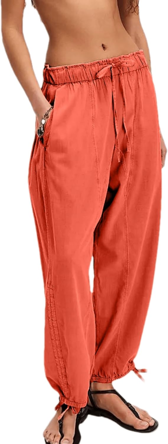 Aimiray Women's High Waisted Wide Leg Linen Pants Elastic Drawstring Casual Flowy Barrel Pants with Pockets
