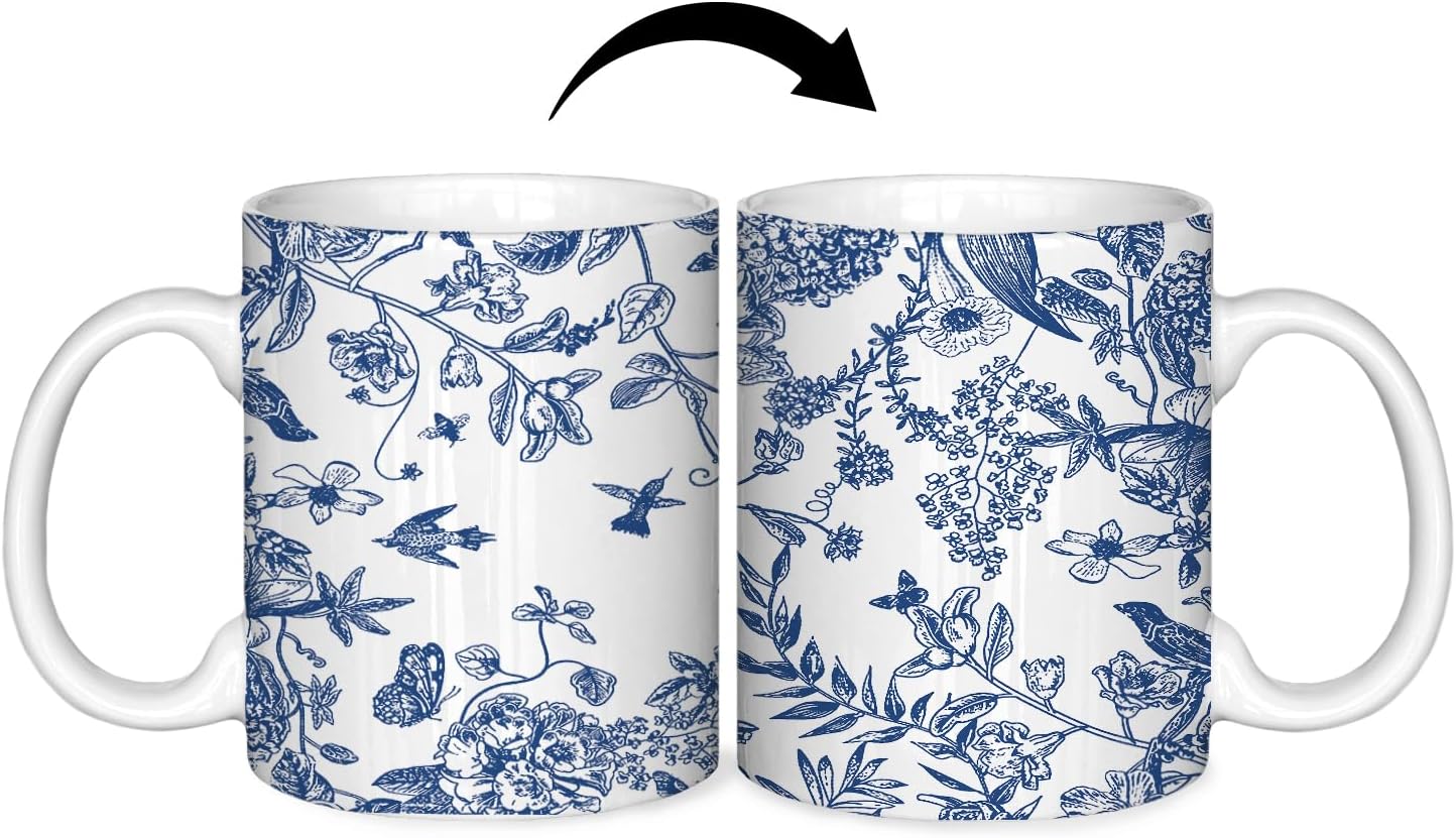 Blue and White Chinoiserie Mug, Vintage Blue Floral Coffee Mug, Chinoiserie Botanical Floral Bird Mug, Blue and White Ceramic Coffee Mug 11 oz