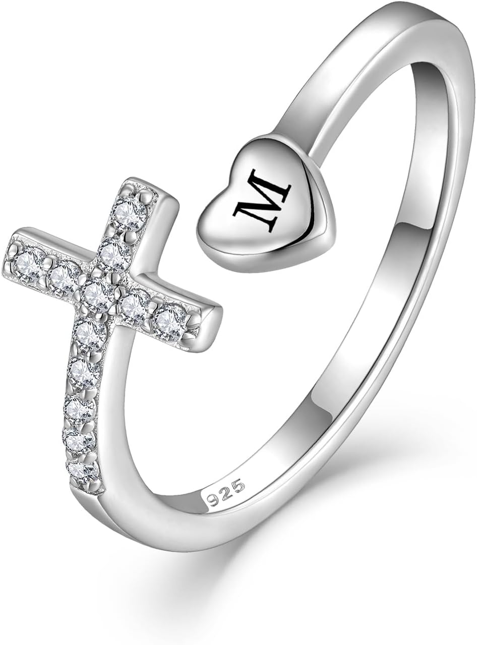 STARCHENIE Cross Initial Ring for Women 925 Sterling Silver Letters A-Z 26 Alphabet Adjustable Ring Size 7