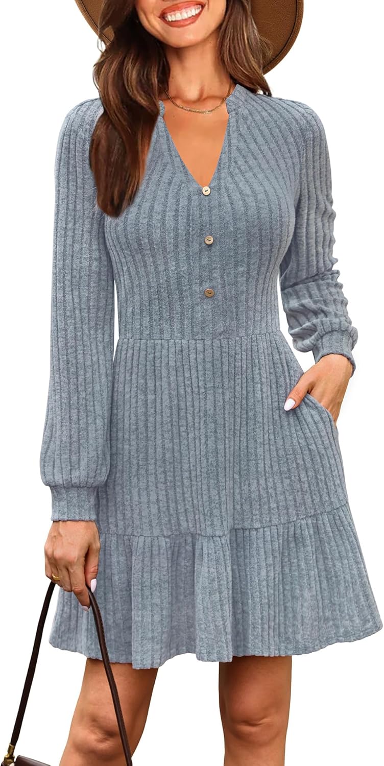 Kranda Women 2026 Spring Long Sleeve Button V Neck Casual Knit Ribbed Winter Sweater Short Mini Dresses with Pockets