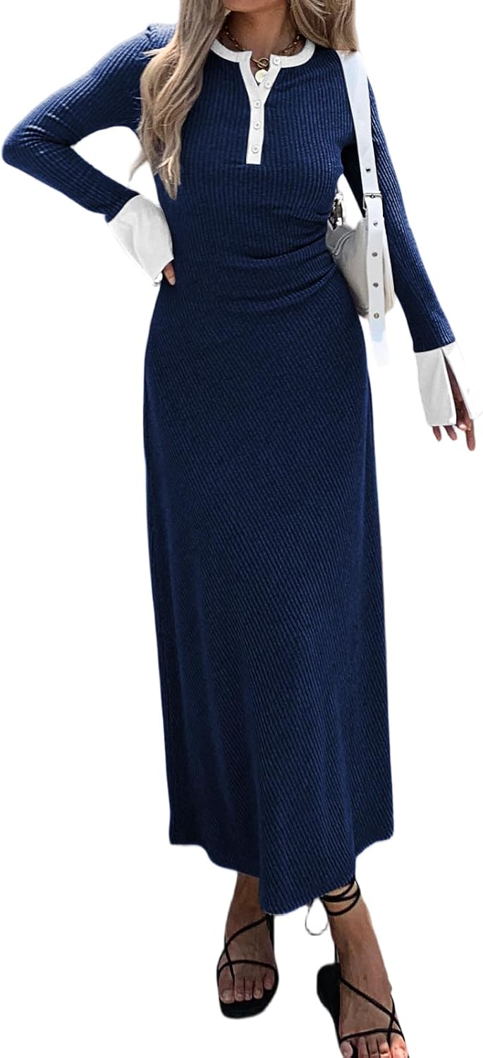 Womens Sweater Dress V Neck Ribbed Maxi Dress Long Bell Sleeves Button Down Slim Fit Bodycon Casual Knit Dress