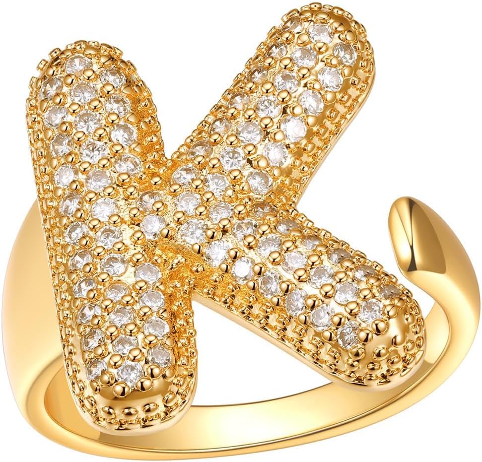 FindChic Initial Ring for Women, Gold Plated Chunky Letter Rings Open Adjustable Trendy Sparkling Cubic Zirconia Personalized Statement Rings Jewelry Gift
