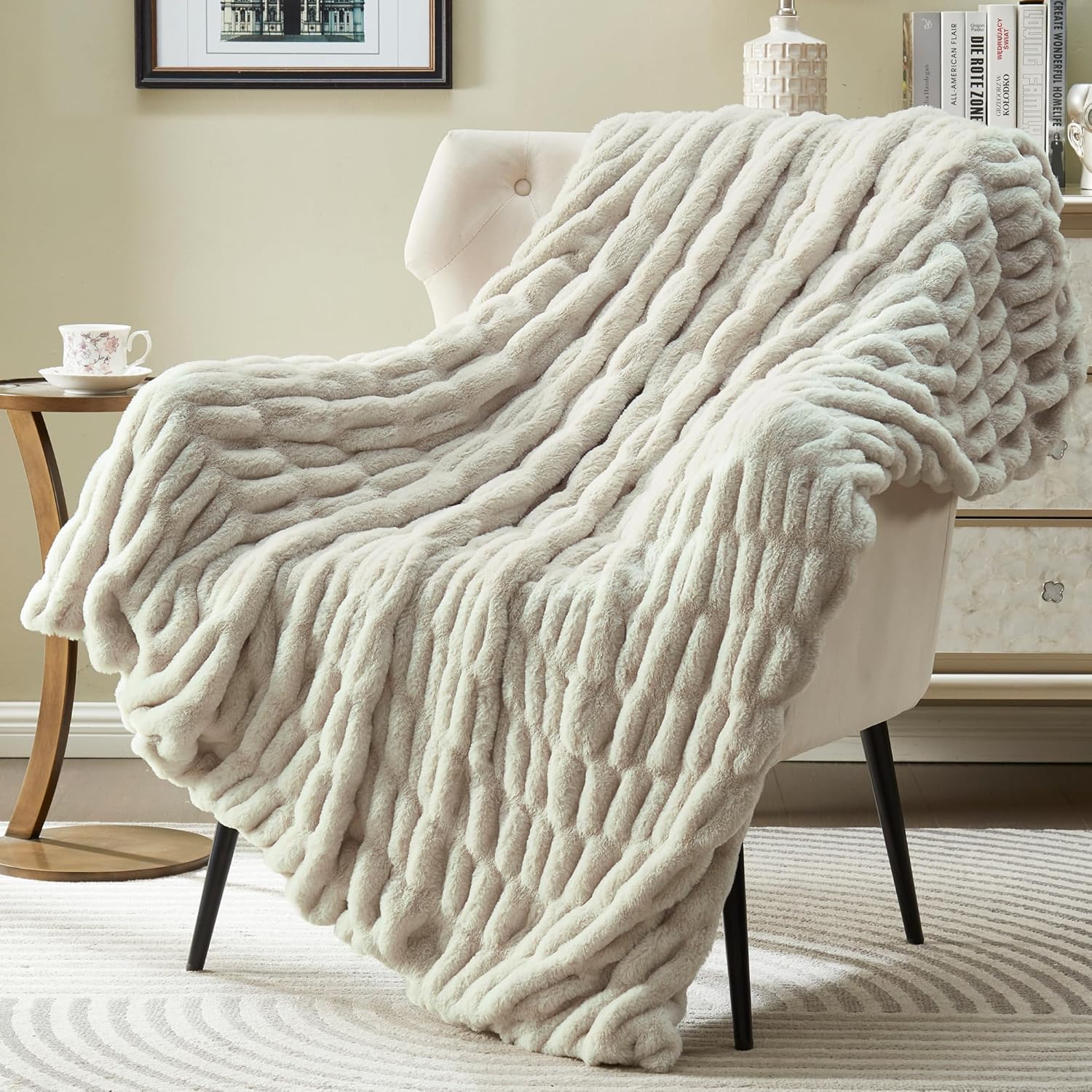 JONIYEAR Solid Cozy Fuzzy Ruched Faux Rabbit Fur Throw Blanket 50" x 60", Decorative Shaggy Fluffy Raffle Blanket for Couch Sofa, Soft Cute Accent Furry Blankets, Warm Blankets for Winter, Sand White
